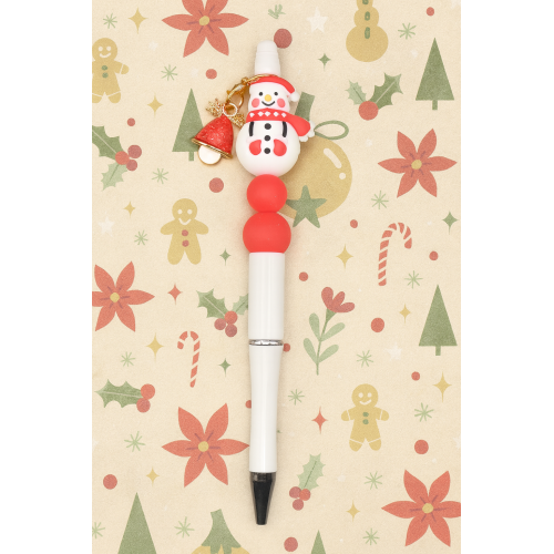 Deze charmante pen straalt pure kerstsfeer uit, met bovenop een vrolijke sneeuwpop die je meteen laat glimlachen. De sneeuwpop draagt een rood sjaaltje en een kleine kerstmuts, terwijl een glanzend rood belletje speels bungelt aan een goudkleurige ring. De rode kralen vormen een speelse overgang naar het strakke, witte penlichaam, wat een mooi contrast geeft tussen gezellig en stijlvol. Tegen de zachte, feestelijke achtergrond vol kerstboompjes, zuurstokken en sterretjes lijkt deze pen bijna een klein cadeautje op zichzelf – perfect om winterse plannen, wensen en lieve boodschappen mee op papier te zetten.