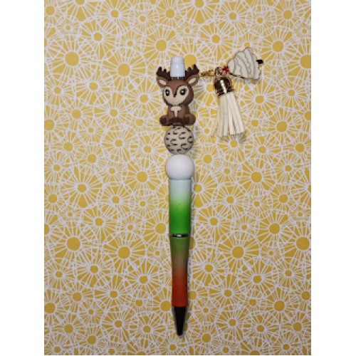 Deze vrolijke pen heeft een speels winters ontwerp met bovenaan een schattig hertje. De pen is versierd met kralen in neutrale tinten en een kleurrijk verloop in wit, groen en oranje voor een frisse en unieke uitstraling. Aan de bovenkant hangt een feestelijk kwastje met een goudkleurige hanger in de vorm van een kerstboom, wat zorgt voor een charmant seizoensaccent. De pen ligt fijn in de hand en is perfect als leuk cadeautje, voor school of werk, of als sfeervolle accessoire tijdens de feestdagen.