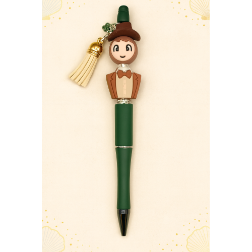 De Charmante Cowboy Pen is een opvallende en vrolijke balpen met een cowboyfiguurtje als unieke topper. Het karakter draagt een hoed, strik en jasje, waardoor de pen direct een speelse westernuitstraling krijgt. Aan de bovenzijde hangt een decoratieve kwast met bedeltje, wat het geheel extra charme geeft.