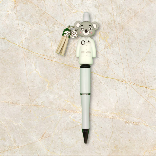 Deze vrolijke schrijfpen is een echte blikvanger en combineert functionaliteit met een speels design. Bovenop de pen staat een schattig beer-figuurtje in zorgoutfit, wat de pen een warme en vriendelijke uitstraling geeft. De decoratieve hanger met kwastje zorgt voor een extra leuk detail en maakt de pen ook geschikt als klein cadeautje.