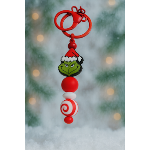 Breng de feestdagen tot leven met deze speelse Grinch kerst sleutelhanger! Het iconische groene gezicht van de Grinch, compleet met zijn kerstmuts, wordt gecombineerd met sierlijke kralen in rood, wit en een vrolijk swirl-patroon.